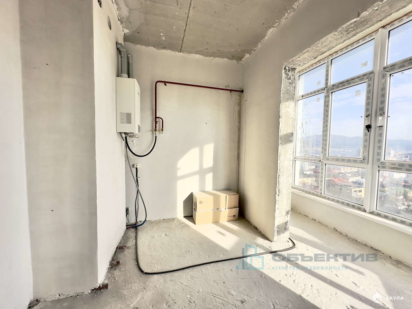 В квартире выполнена предчистовая отделка: оштукатурены стены, установлен двух контурный газовый котел, электрика, вода.