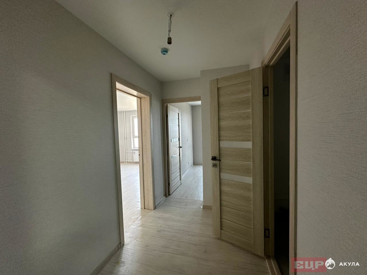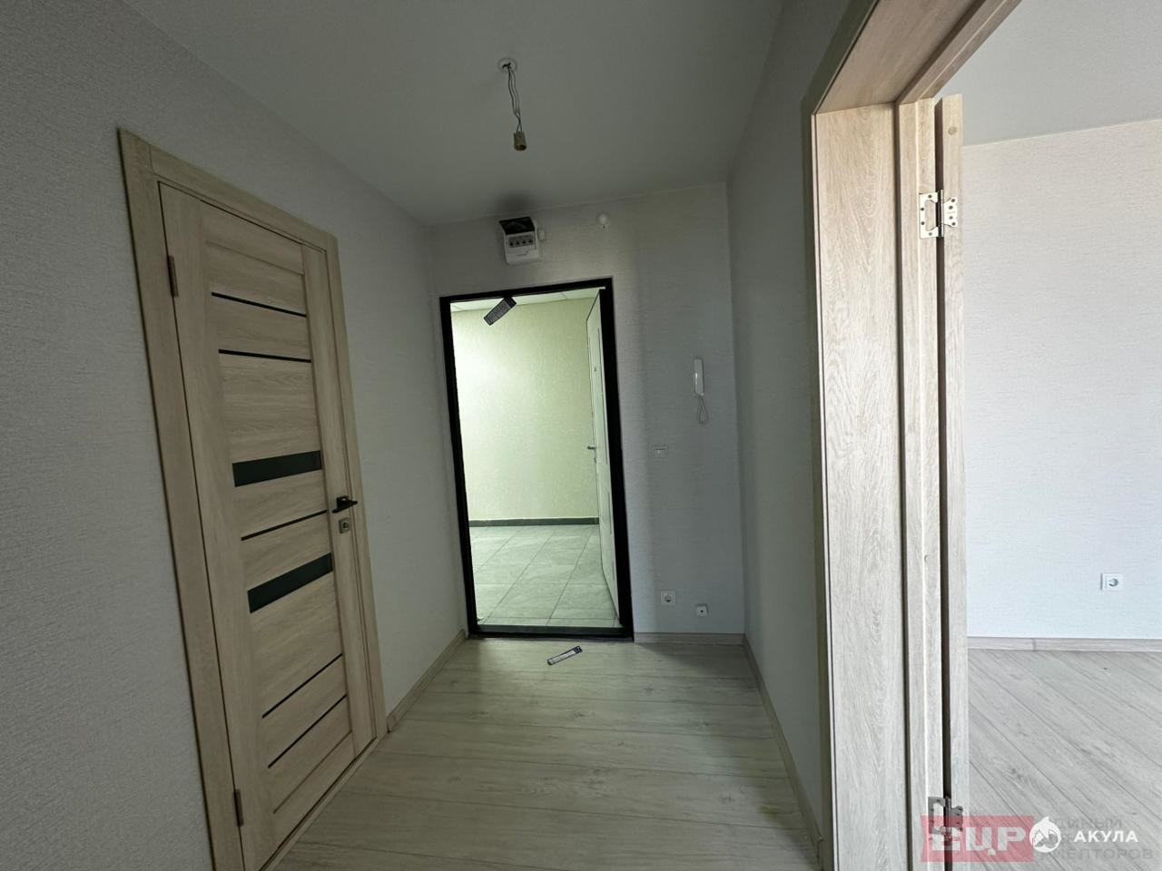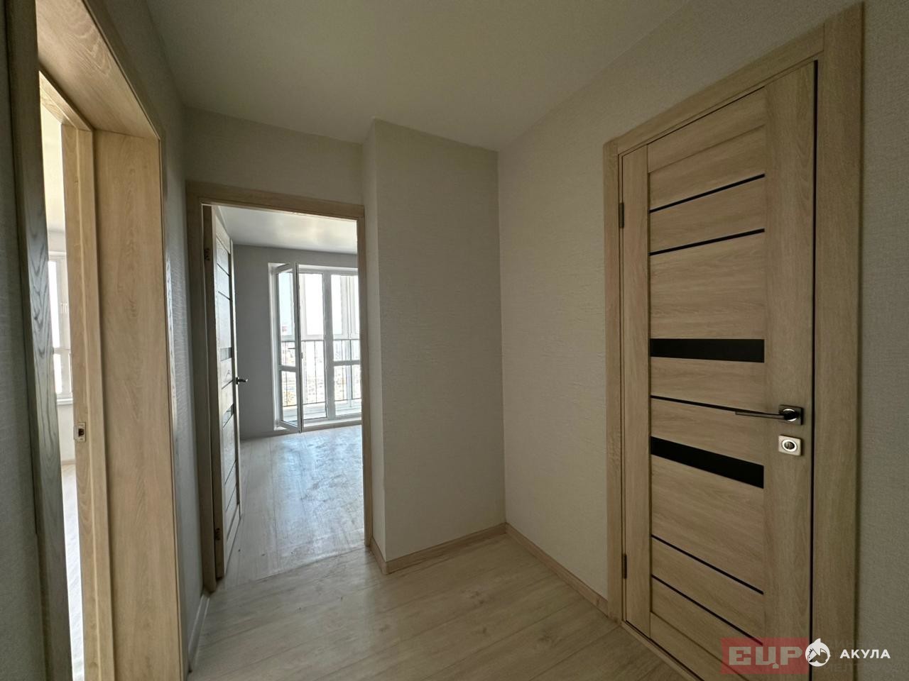 Установлена качественная входная дверь, межкомнатные двери выполнены в цвете дуба, а потолки оформлены матовыми натяжными покрытиями.