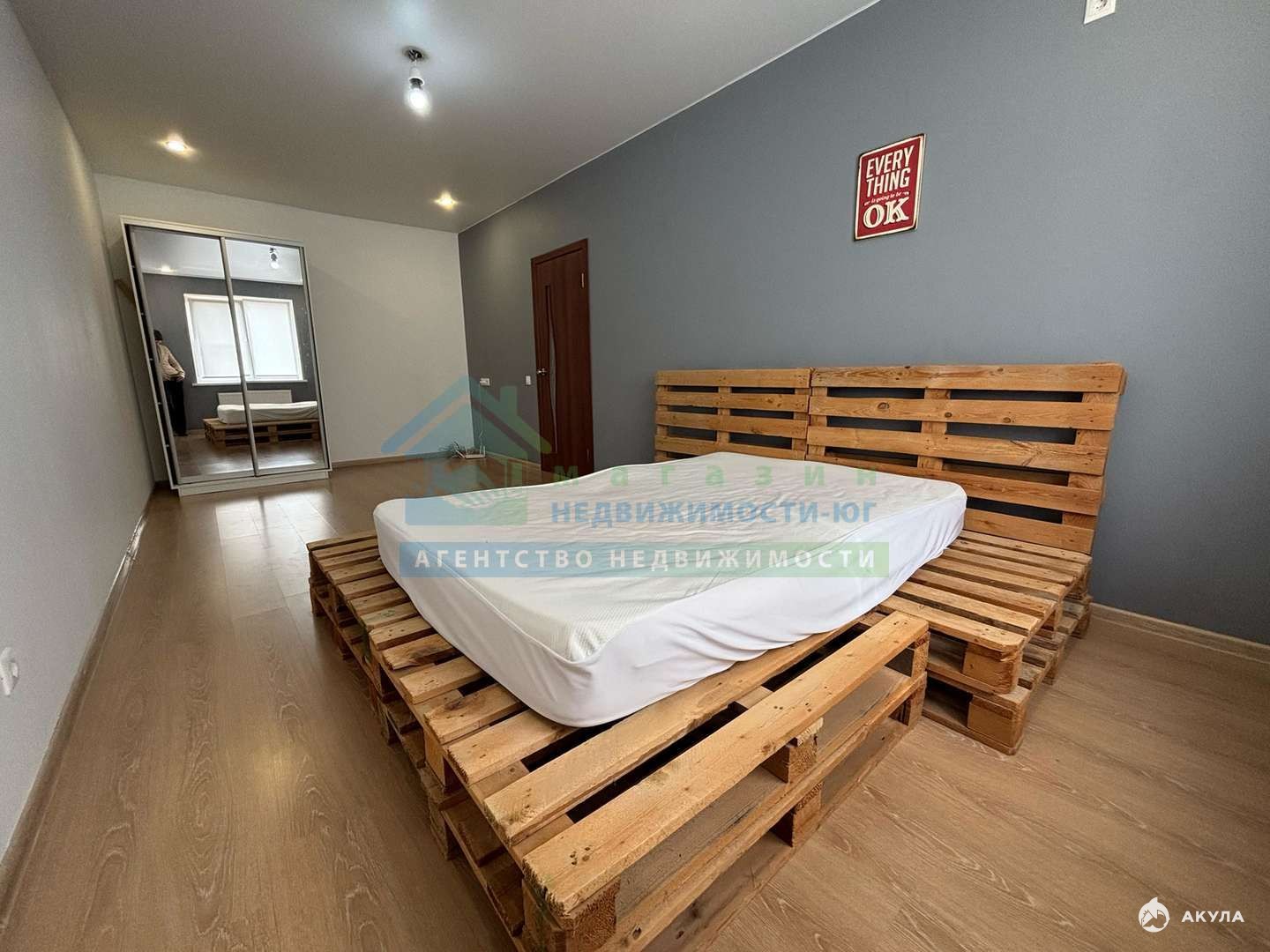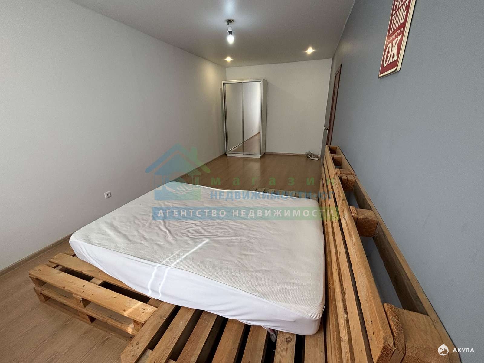 В спальне есть кровать и шкаф-купе для одежды.